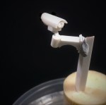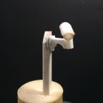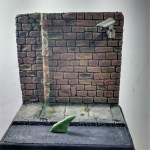 Pared de poliestireno expandido texturizado. Tubería, cámara y bordillo hechos con diferentes tubos y cuadradillos de plástico. Acera de cartón pluma. Asfalto de papel de lija. Aleta de tiburón de masilla verde. Base de PVCE.