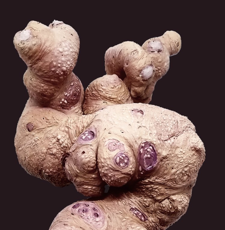 El trozo de espuma tenía en origen un color rosa ideal y todas las texturas (burbujillas, rasgaduras, protuberancias varias, etc) ya estaban ahí, así que sólo era cuestión de darles vidilla. Además, con cortarle la parte inferior para darle una base estable, ya estuvo hecho todo el trabajo bruto.