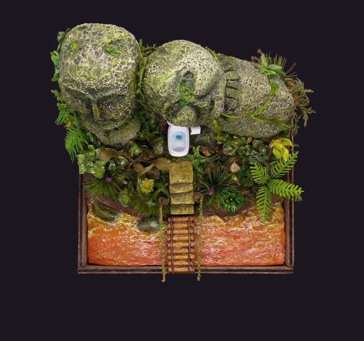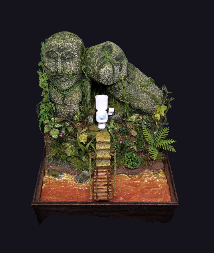 Las estatuas ruinosas son de un adorno de acuario y el WC es un bit de resina de Euphoria Miniatures. El rollo de papel está hecho a mano. La vegetación contiene en su mayoría plantitas naturales preservadas en glicerina y algunas artificiales (matojos de hierba alta de Green Stuff World, plantas hechas con pestañas postizas baratas, un helecho de papel de Mig Jimenez y una planta de plástico modificada). Para el suelo usé poliestireno extruido recubierto de una mezcla de tierra, arena, piedrecillas y Gesso. El río está hecho «old school style»: base de poliestireno, capa de Gesso, pintura, Mod Podge Gloss y Water Texture de Vallejo para las «olas» y un par de capas muy finas de Still Water, también de Vallejo, a modo de barniz brillante.