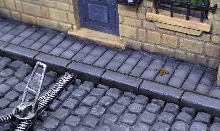 Acera de PVC espumado tallado y planchas de adoquines de la gama Flexiway de Juweela. Las planchas son flexibles, pero para mantener la forma rellené las juntas con resina acrílica y las reforcé por debajo con chapa de una lata de cerveza. Para la cremallera, usé una cremallera (increíble, ¿no?).
