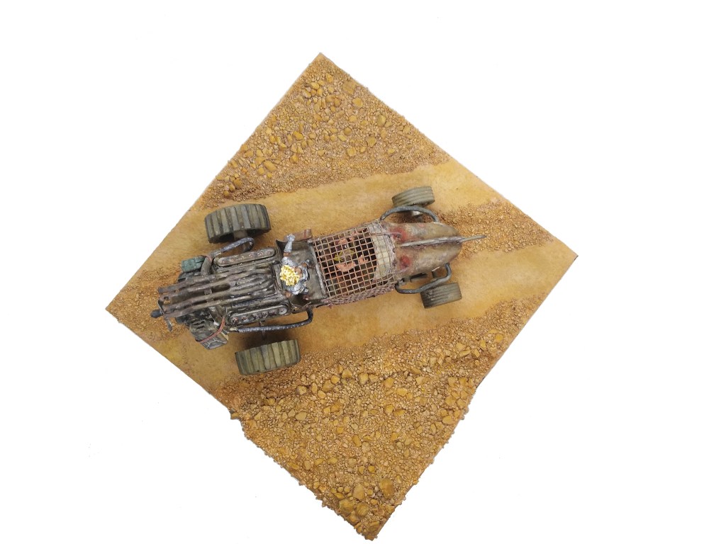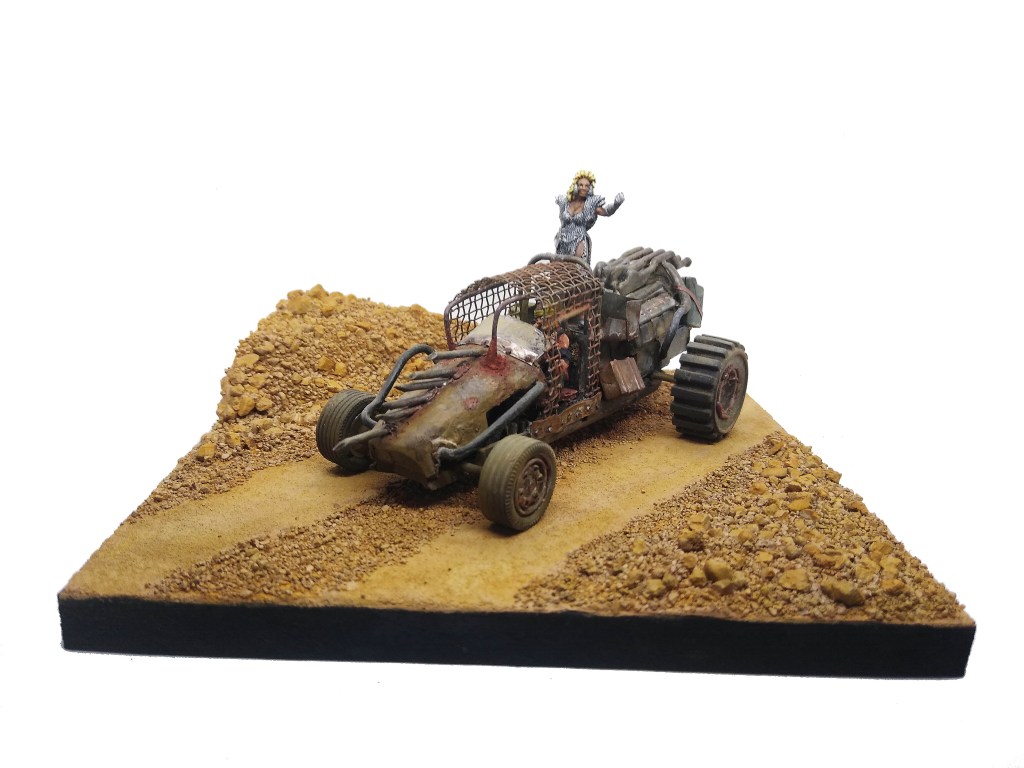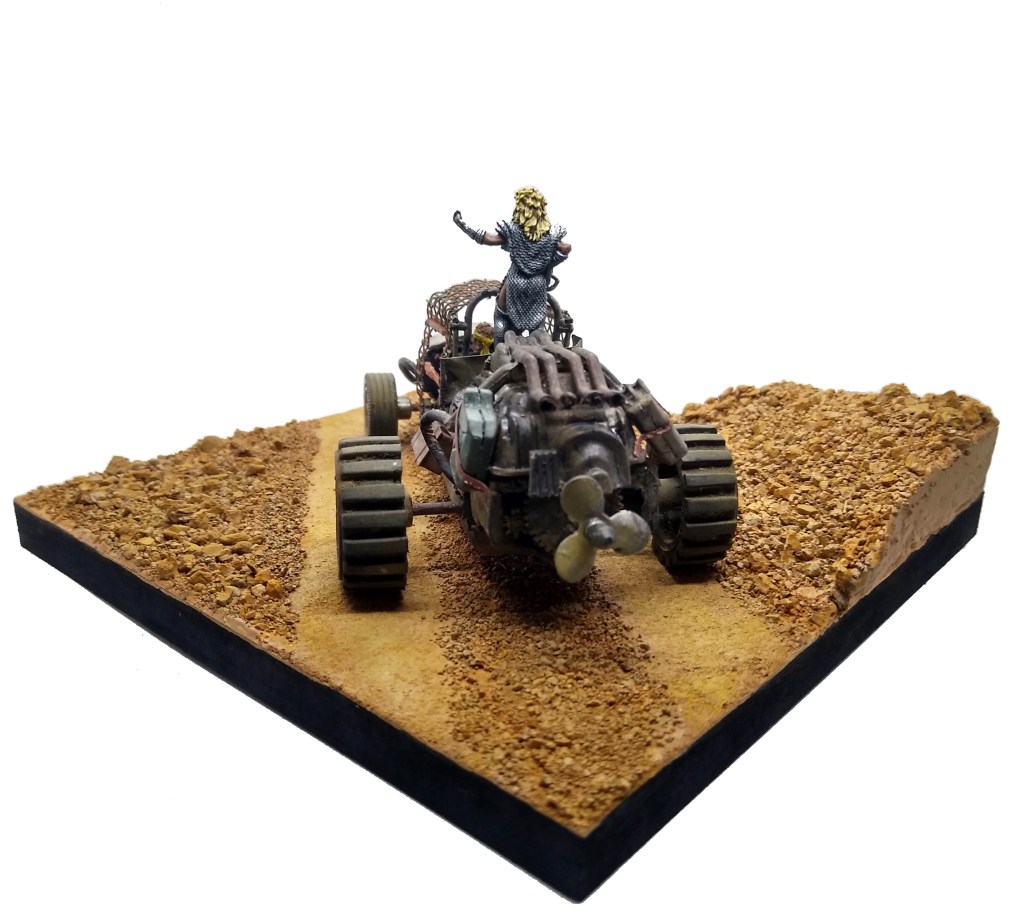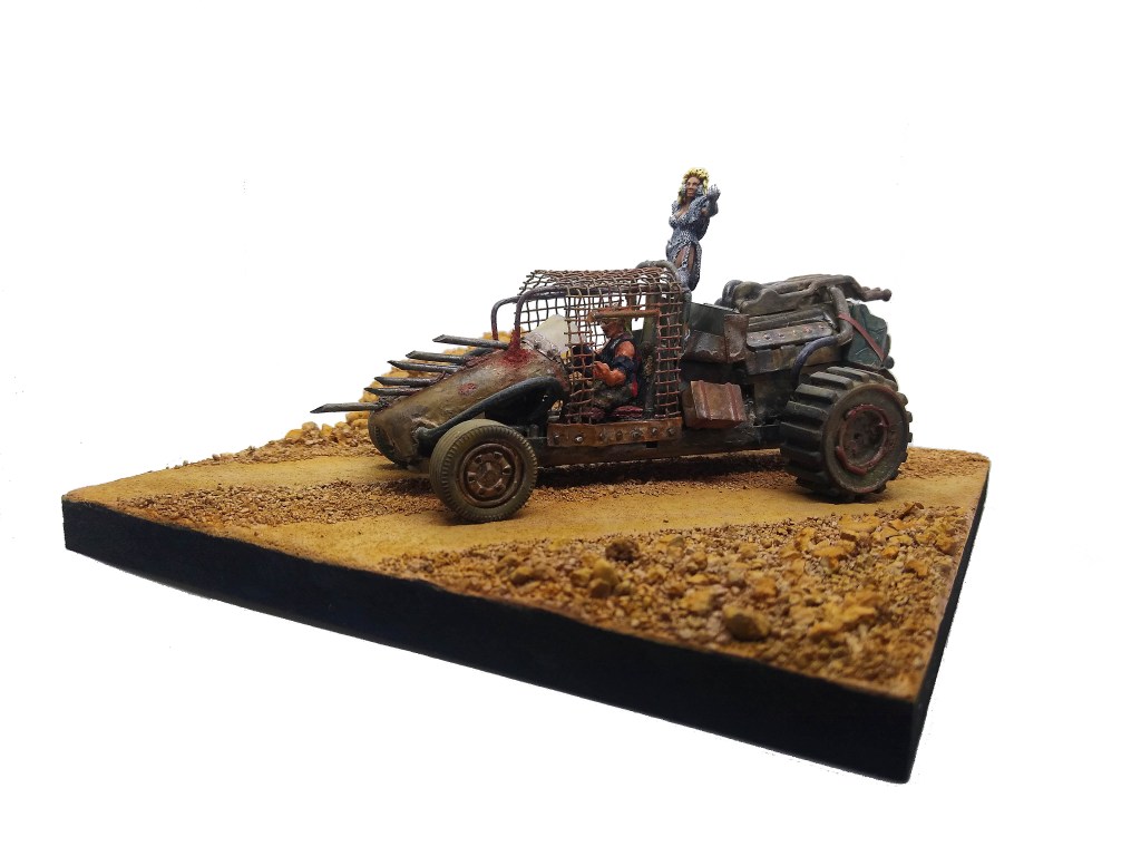 Todo scratch excepto la figura de Tía Ama de Hungry Troll Miniatures. El conductor está hecho con partes de figuras viejas. El vehículo, rescatado de un viejo diorama que desgraciadamente ya no existe por cuestiones de espacio y mudanzas varias, está hecho con partes de coches de Scalextric y piezas de juguetes y similares .