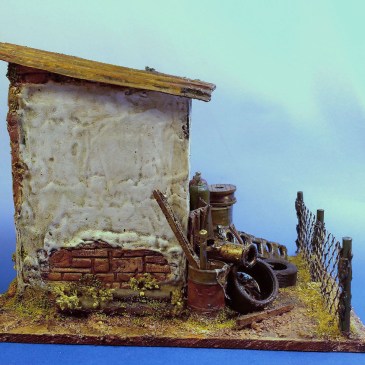 Pequeña barraca típica de suburbios, polígonos industriales y demás sitios de mal vivir. Cartón pluma, cola blanca, Gesso, arena, césped electroestático, cartón corrugado y rejilla metálica. La chatarra es una mezcla de piezas aleatorias de plástico modificadas y restos de kits (bobina, bidones, bombonas, pala y neumáticos). Puerta de cartón pluma, cadenilla de bisutería y … More Barraca chatarrarero (1:56/28mm)